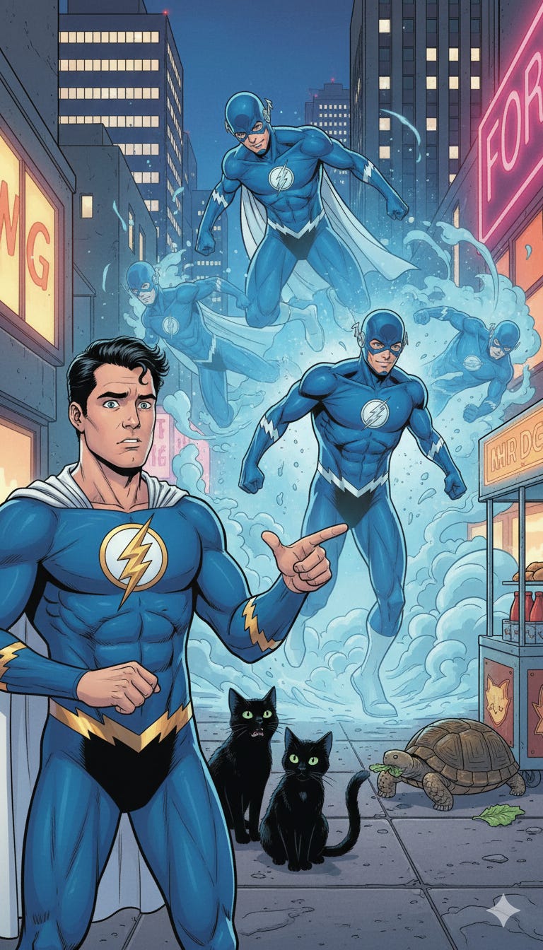 Iperboy e Catcat sono fermi davanti a un chiosco di hot dog. Accanto a loro, una scia azzurra sfuocata continua a fare avanti e indietro, alzando folate di vento che spostano solo i tovagliolini usati.